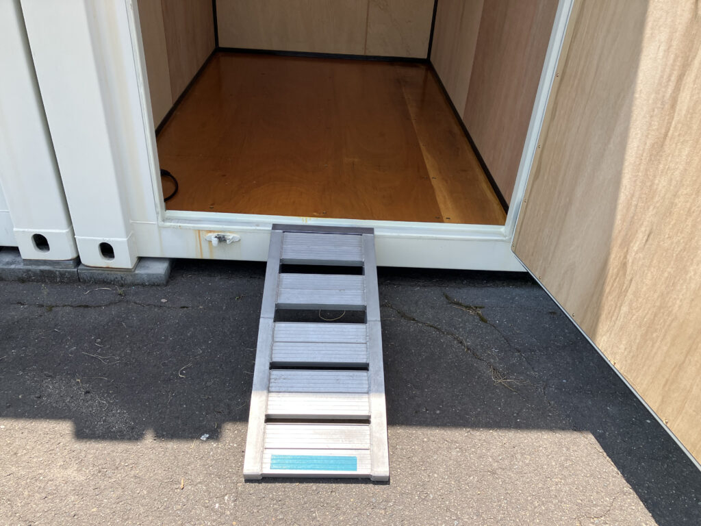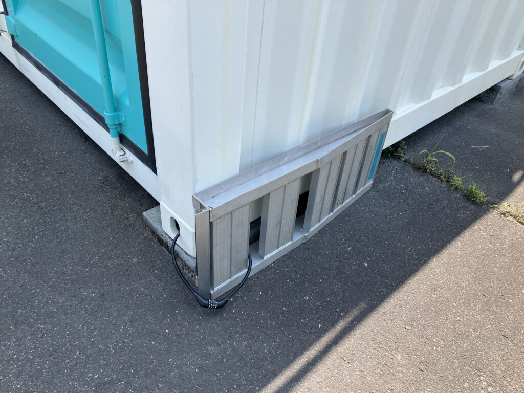 コンテナの横にスロープがワイヤー錠で